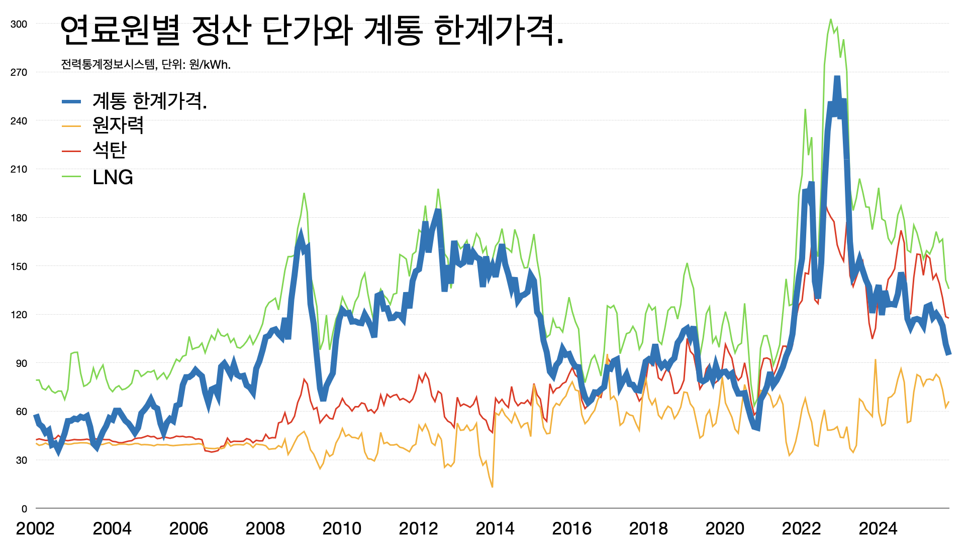 - 계통 한계가격을 기준으로 정산 단가가 결정됩니다. 최근 20여 년의 흐름으르 보면 LNG 가격과 계통 한계가격이 거의 비슷하게 움직이죠.