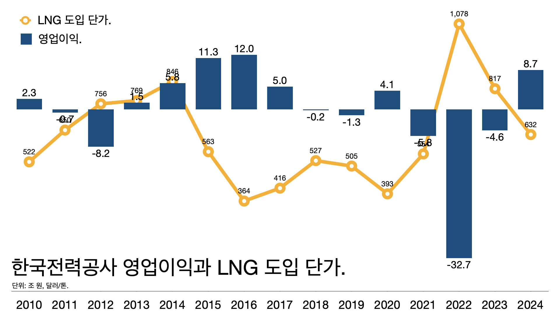 - 아래 그림을 보면 실제로 LNG 가격이 오를 때마다 한전의 영업이익이 반대 방향으로 움직이는 걸 볼 수 있습니다.