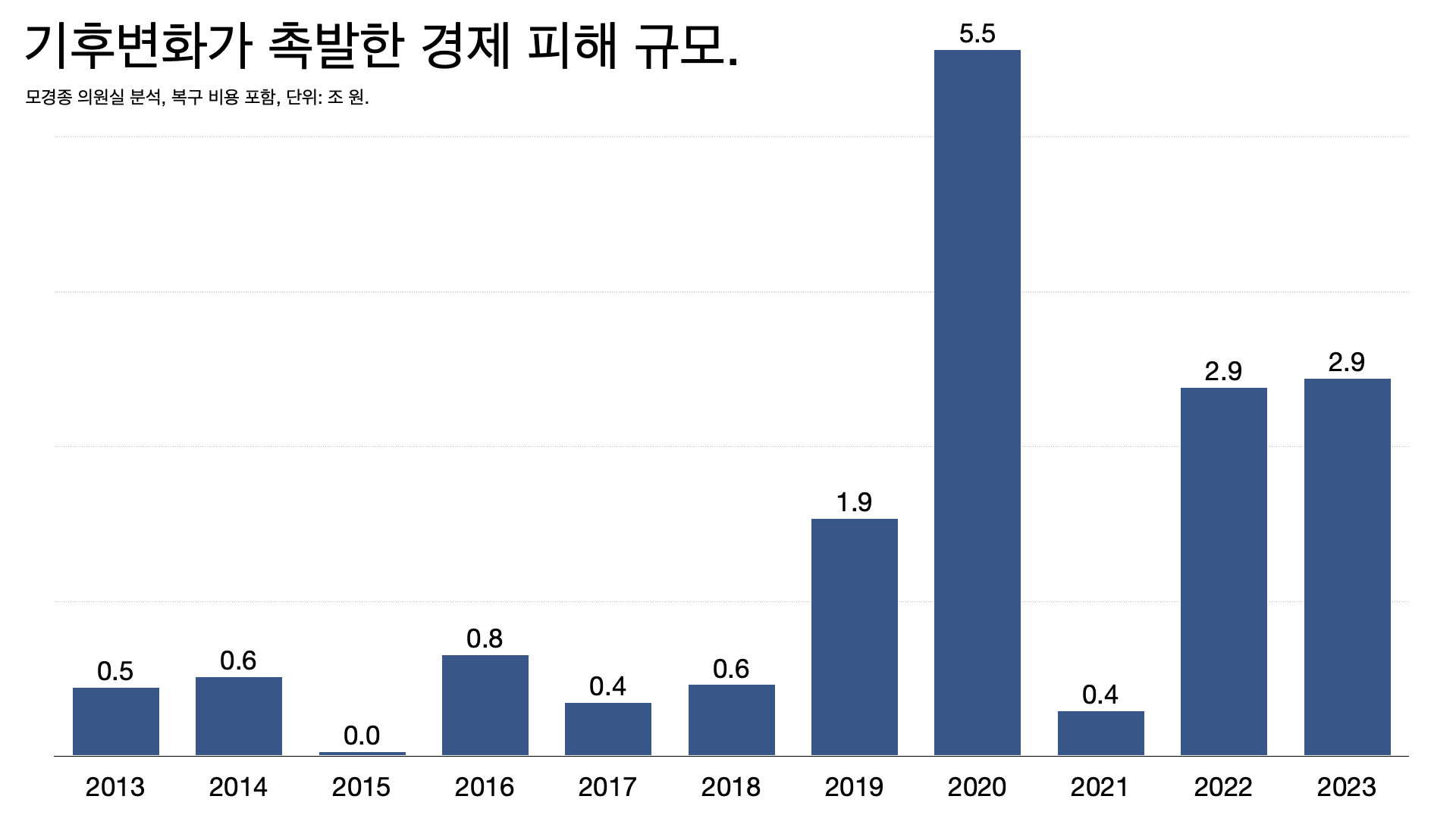 - OECD에 따르면 2021~2023년 기후 관련 재해의 손실은 연간 2500억~2800억 달러에 이릅니다. 80억 인구의 조별 과제라는 말이 나올 정도죠. 정도의 차이는 있지만 모두가 손실을 나눠 안는 구조입니다.