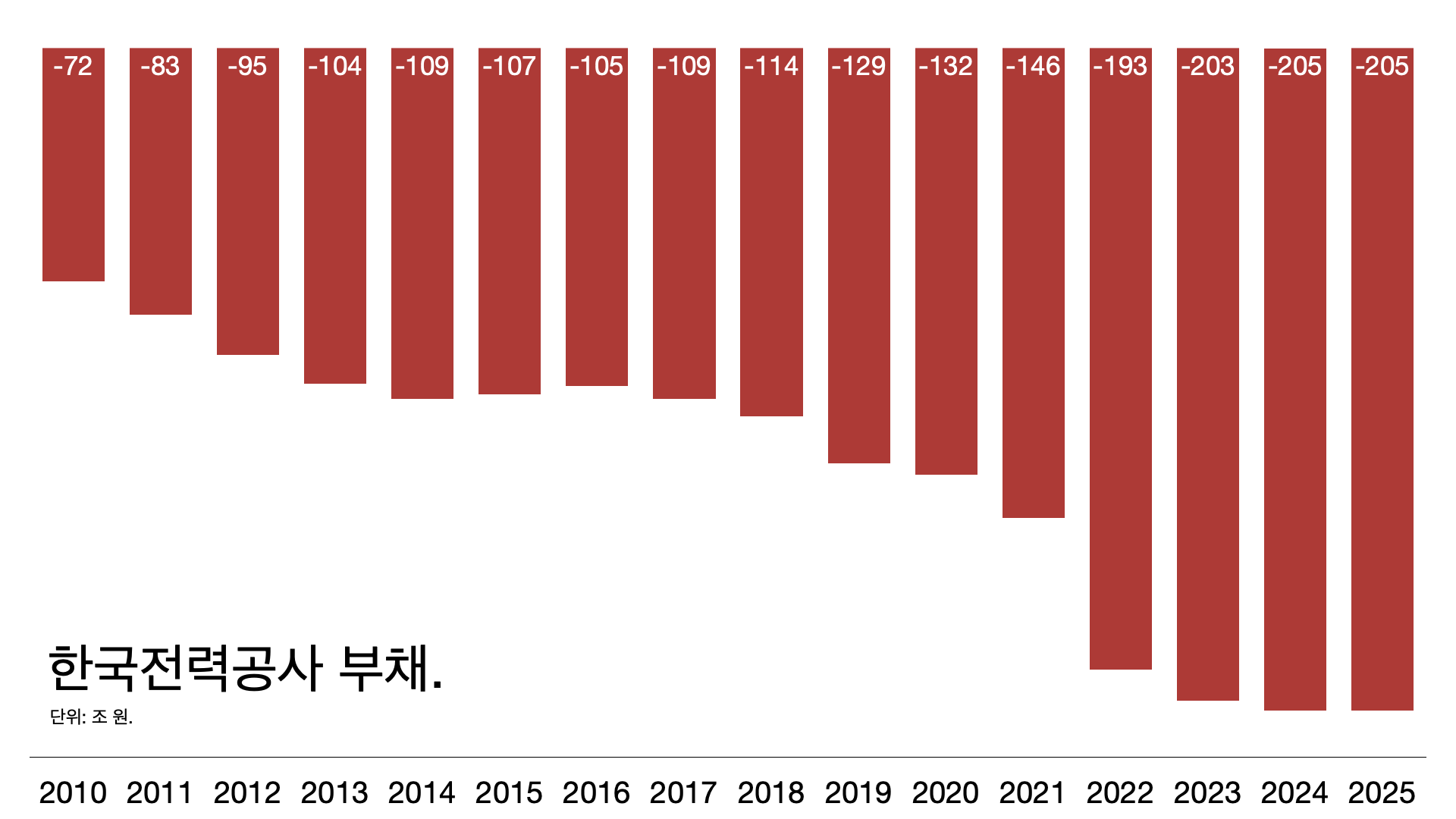 - 그런데 2022년 러시아-우크라이나 전쟁으로 LNG와 석탄 가격이 치솟았습니다. 한전이 발전사에 지불해야 할 전기의 원가도 크게 뛰어올랐습니다. 그런데 정작 전기요금은 제때 올리지 못했고 한전이 손해를 떠안으면서 부채가 205조 원으로 불어났습니다.