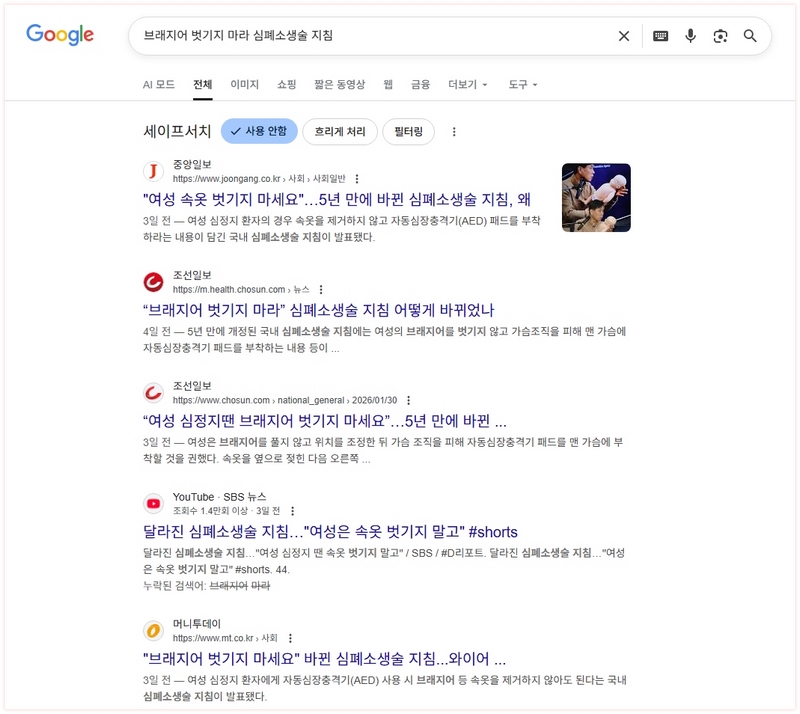 우선 의학적 팩트부터 명확히 하자. ‘와이어가 있는 속옷 위에 제세동을 하면 위험하다’는 속설은 과장됐다. 최신 연구들에 따르면 브래지어 착용 상태에서의 제세동이 심각한 화상이나 기기 오작동을 유발한다는 근거는 희박하다. 실제로 유럽(ERC)이나 미국(AHA) 역시, 속옷 제거로 시간을 지체하는 것보다 빠른 제세동이 더 중요하다는 점을 강조하는 방향으로 무게중심이 옮겨가고 있다. 즉, 옷을 벗기지 말라는 한국의 지침은 과학적으로 안전하며, 국제적 표준에서 벗어난 것이 아니다.