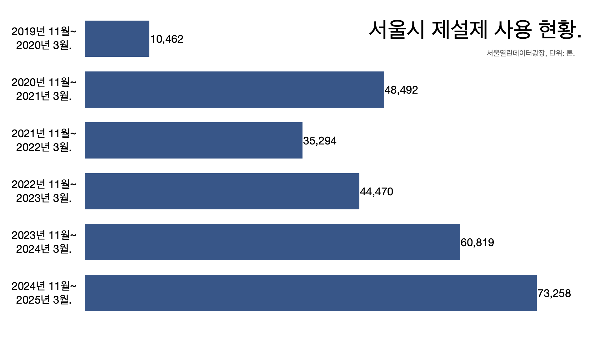 - 서울시가 뿌린 제설제가 2020년 겨울에는 1만 톤 정도였는데 2021년 5만 톤으로 늘었고 2024년은 6만 톤, 지난해는 7만 톤을 넘겼다.