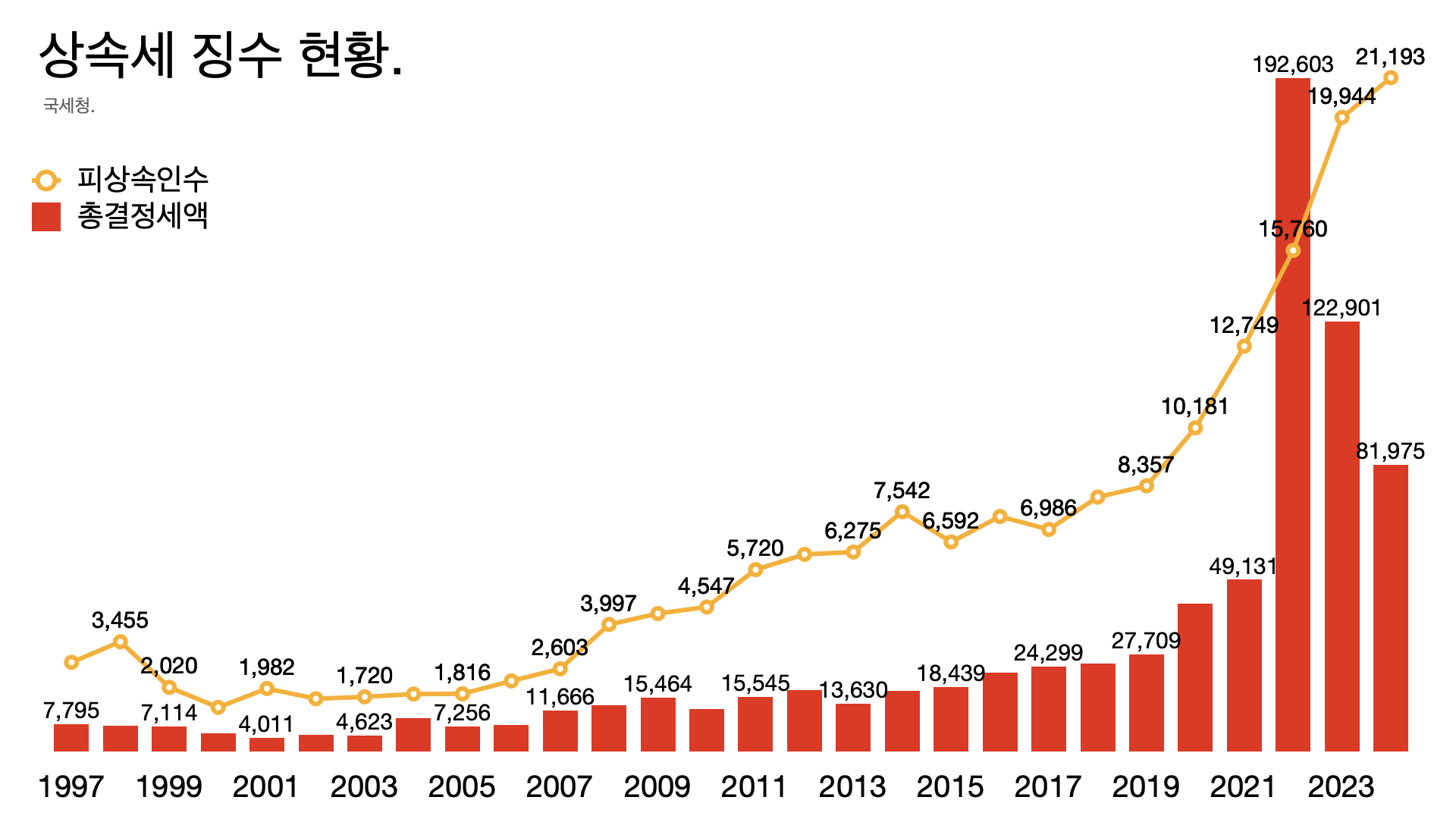 - 대한상공회의소가 제대로 말하지 않은 것이 있다. 상속세 과세 대상은 늘었지만 세수는 2023년과 2024년 2년 연속 줄었다. 부동산 공시가격이 낮아진 영향이다.