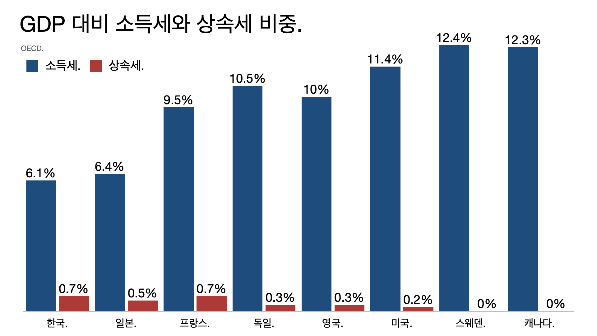 - 한국이 상속세 최고 세율이 높은 건 사실이지만 상속 공제와 세액 공제가 많아 실효 세율이 높지 않다는 사실을 간과해서는 안 된다. 실효 세율은 21% 수준이다. 게다가 다른 나라보다 소득세가 낮다는 사실을 감안해야 한다.