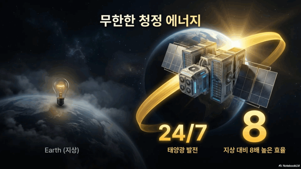 - 고도 500~2000km에 데이터센터를 만들면 하루 종일 1년 내내 전력을 받을 수 있기 때문에 지상의 10배 효율이 난다. 발열도 해결되고 부동산 문제도 없다.