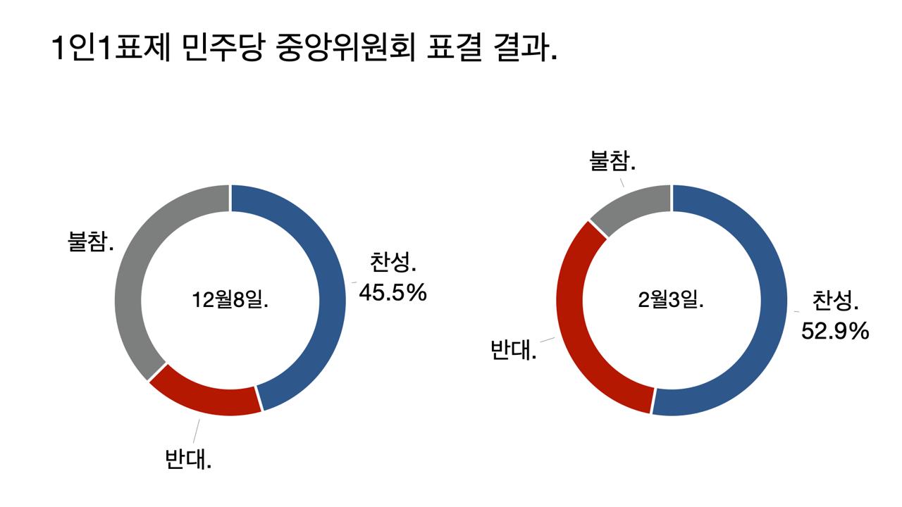 - 대의원과 권리당원의 영향력을 20:1에서 1:1로 맞춘다. 그만큼 당원들의 영향력이 커졌다.