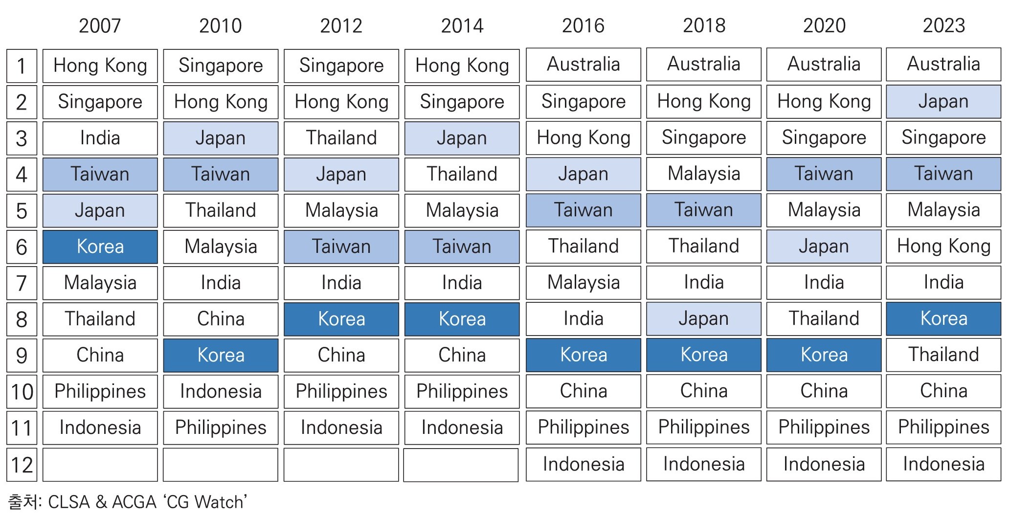 - 아시아기업지배구조협회(ACGA)와 글로벌 투자분석회사 CLSA 보고서를 보면, 한국의 기업 지배구조 순위가 2023년 아시아 12개국 중 8위다. 일본은 2위, 대만은 4위다. 2007년에는 대만 4위, 일본 5위, 한국 6위였다.