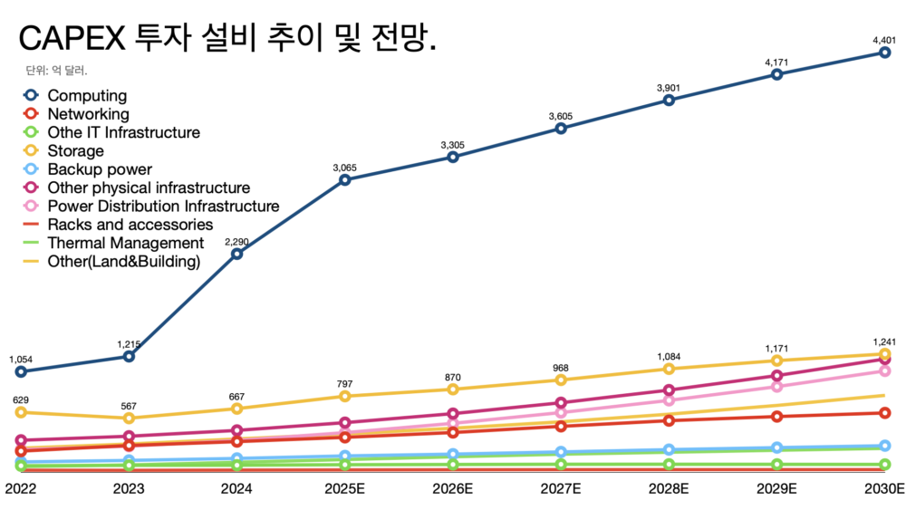 - 옴디아도 비슷한 분석을 내놨다. 주요 빅테크 기업의 설비투자(CAPEX)가 지난해 6000억 달러에서 2030년 1조 달러 수준으로 늘어날 전망이다.