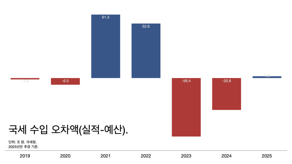 - 2023년과 2024년은 56.5조 원과 30.8조 원을 덜 걷었다.