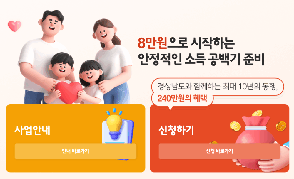 - 40~54세 경남 도민이 대상이다. 경상남도가 8만 원에 2만 원을 지원해 10만 원을 채워준다. 첫 적립일부터 5년 이상 지나고 55세 이상이면 받을 수 있다.