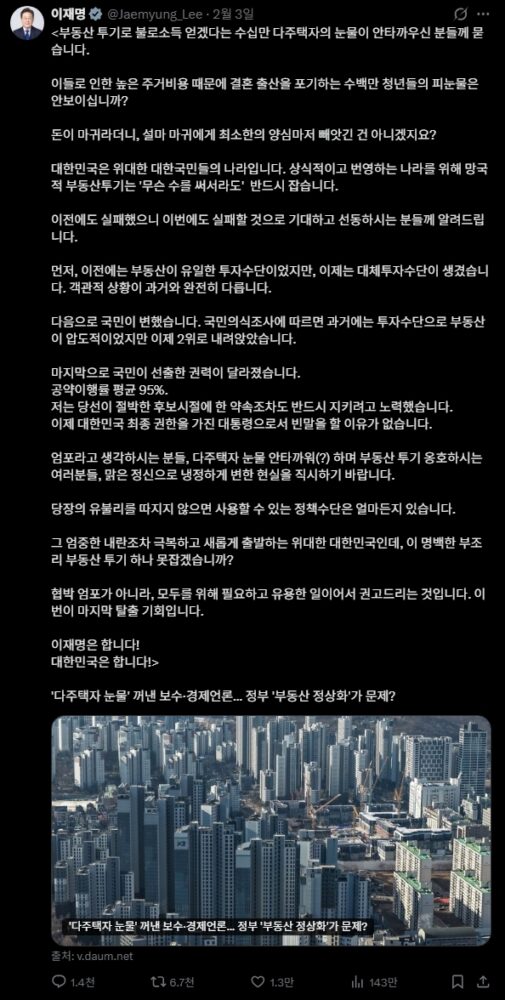 - 이재명(대통령)은 X에 “매입 임대 4만2500세대가 매물로 나오면 집값 안정 효과가 미지수일 것 같지는 않다”는 글을 남겼다.