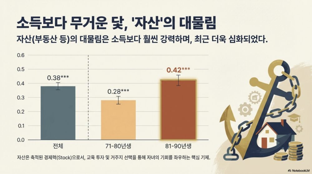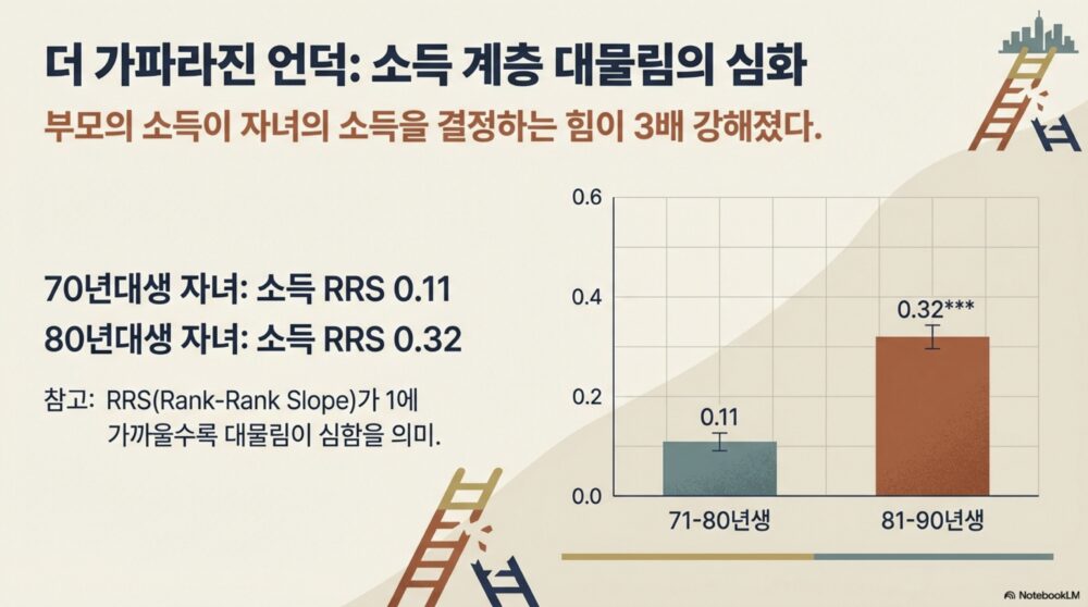 - 1970년대생 자녀의 소득 대물림 지표(RRS)는 0.11이었는데, 1980년대생은 0.32로 뛰었다. 부모 소득 순위가 10위 오르면 자녀 순위가 3.2위 따라 오른다는 말이다.