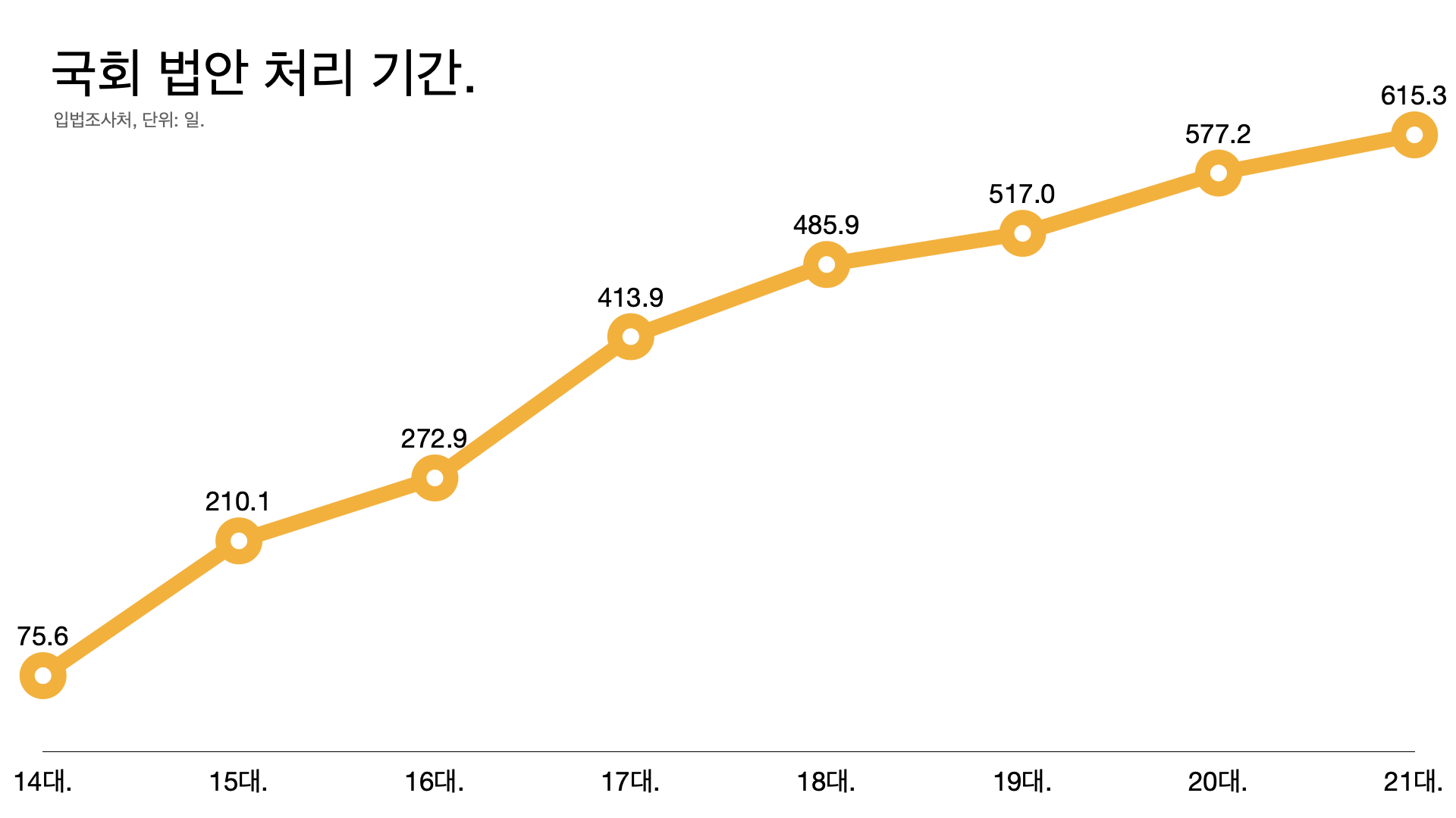 - 두 번째 질문: 국회가 느린 것 맞나. 맞다. 21대 국회에서 법안 처리까지 평균 615일이 걸렸다. 1년 반 이상은 잡아야 한다는 이야기다. 16대 국회에서는 273일이었다. 계속 더 늘어지는 추세다.
