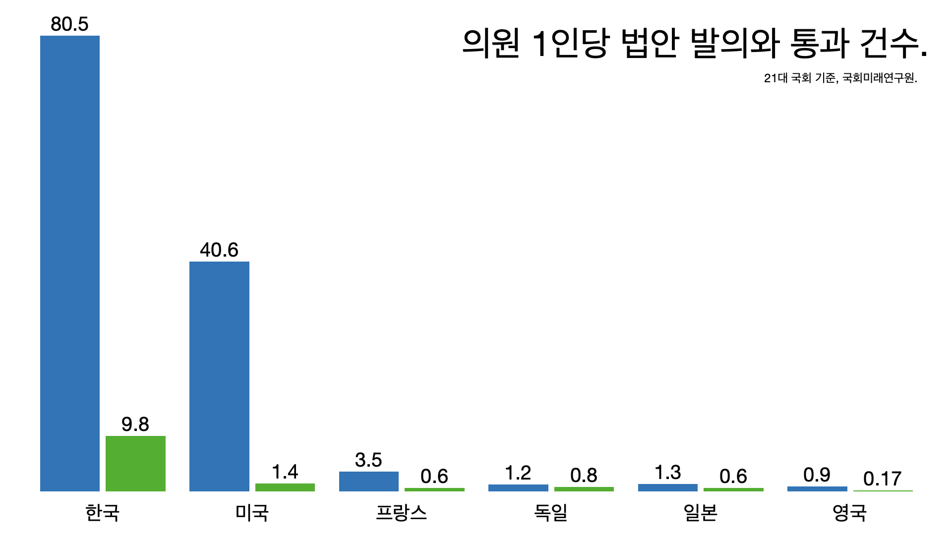 - 네 번째 질문: 다른 나라도 이런가. 한국이 압도적으로 많다. 일본은 의원 1명이 4년 동안 1.3건을 발의하고 0.6건이 통과되는데 한국은 80.5건을 발의하고 9.8건이 통과된다.