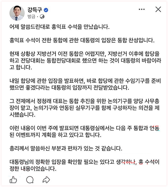 - 강득구는 “사실이 아닌 내용의 글을 올려 삭제했다”고 해명했다. “총리께서 말씀하신 부분과 편차가 있는 것 같다”는 대목을 두고 김민석(국무총리)에게 보내려던 메시지를 잘못 보낸 것 아니냐는 의혹이 돌기도 했다. 김민석이 대통령의 뜻과 달리 합당을 방해한 것 아니냐는 해석도 나온다.
