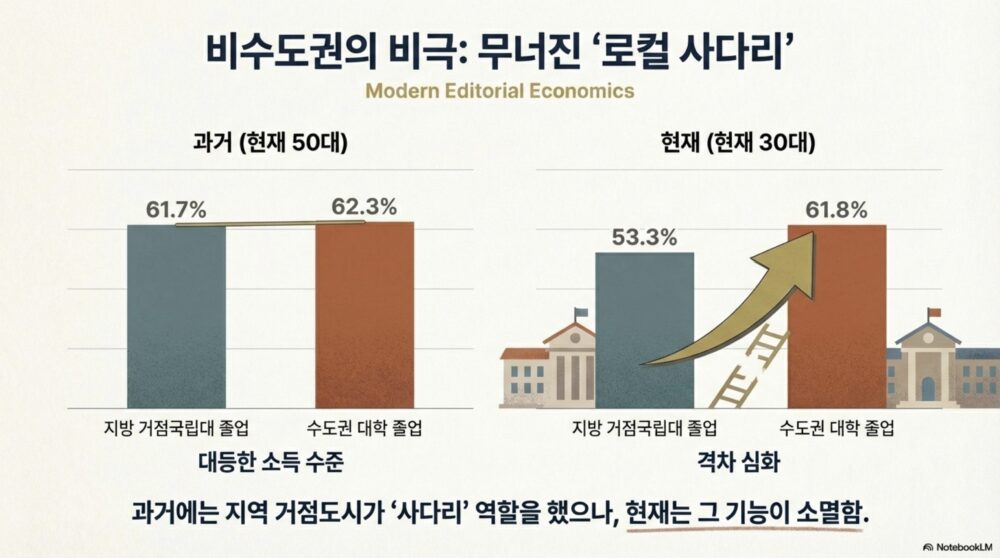 - 부모 소득 하위 25% 자녀가 수도권으로 옮겨오면 상위 50%에 진입하는 비율이 63.3%인데 고향에 머무르는 경우는 35.7%였다.