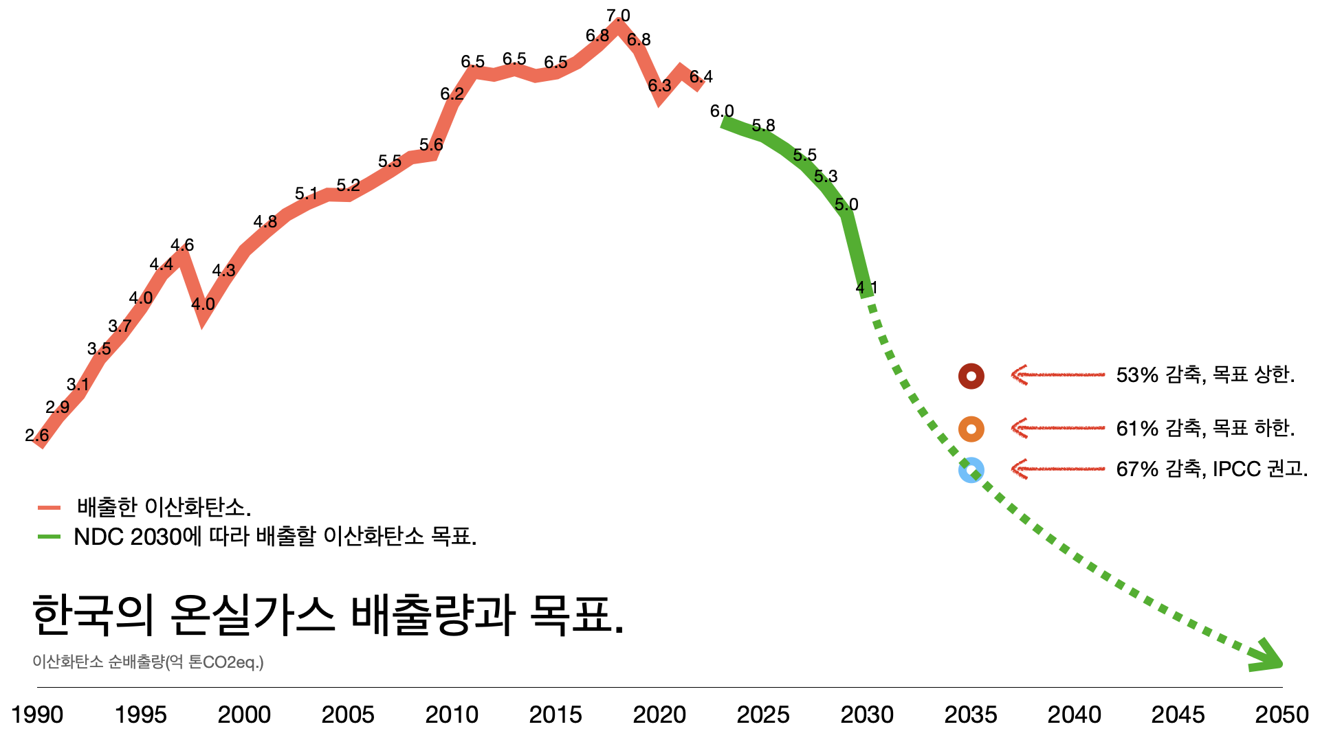 - 2020년 문재인 정부가 2030년까지 2018년 대비 40%를 감축한다는 계획을 잡았지만 이것만으로는 부족하다는 게 헌재 판단이었고 이재명 정부가 지난해 11월 NDC 2035를 잡으면서 감축 목표를 53~61%로 잡았지만 여전히 구체적인 계획이 없기는 마찬가지다.