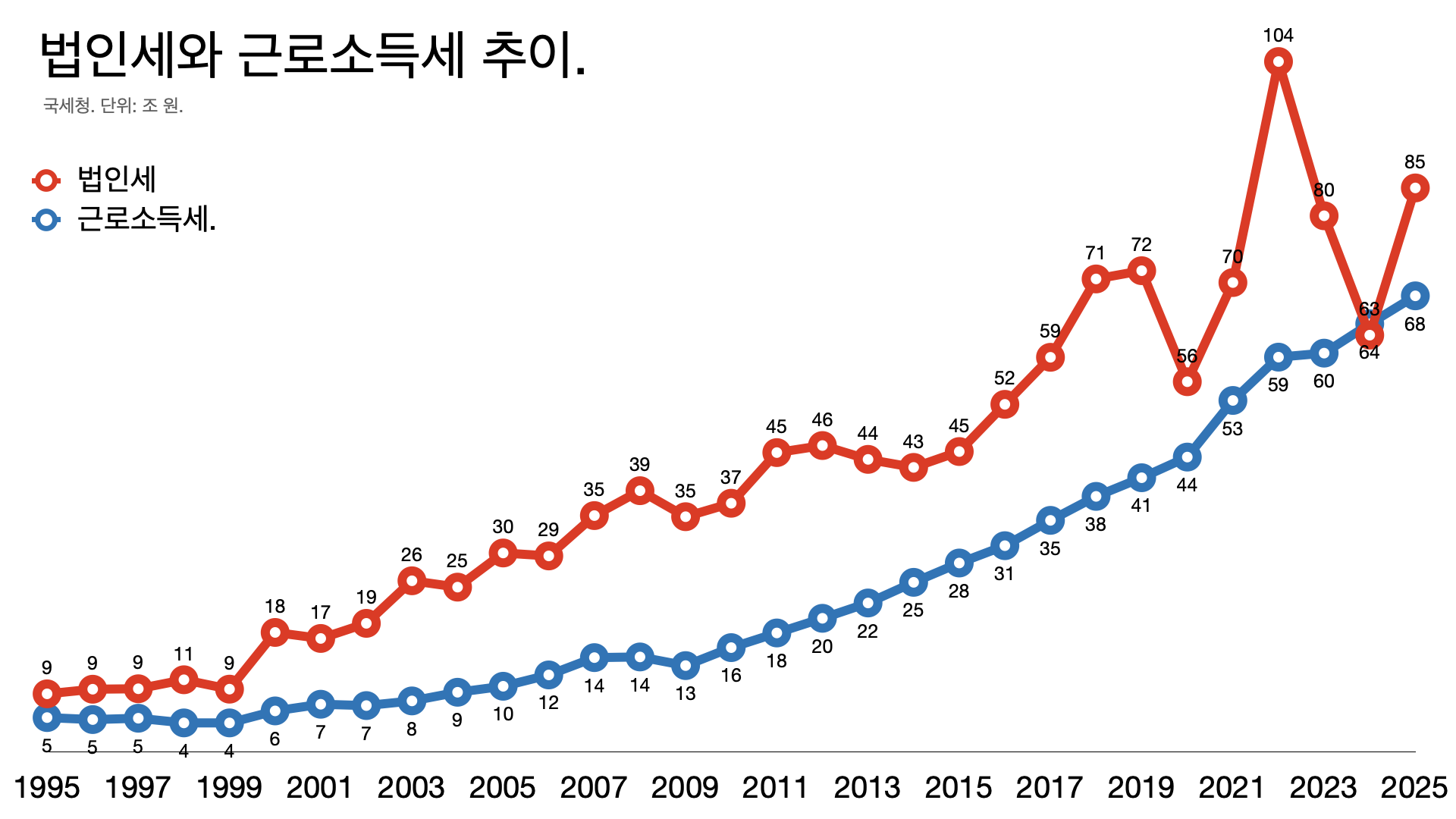 - 법인세는 들쑥날쑥하지만 근로소득세는 꾸준히 오른다. 노동자 수도 늘고 물가에 따라 임금도 늘어나니 자연스러운 결과다. 윤석열 정부 들어 법인세와 양도세 등이 크게 줄면서 상대적으로 근로소득세 비중이 늘어난 것도 사실이다.