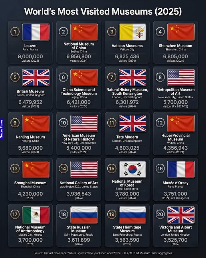 - 프랑스 루브르와 로마교황청 바티칸, 영국 브리티시, 미국 메트로폴리탄에 이어 세계 4위 규모다(최근 자료 기준, 아래 인포그래픽은 2024년 자료).