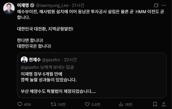 - “해양 수도 특별법이 제정됐다”는 게시물을 공유하면서 “HMM 이전도 곧 한다, 한다면 한다”는 글을 남겼다.