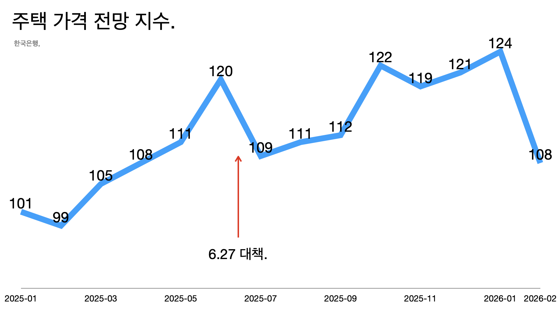 - 주택 가격 전망 지수는 1월 124에서 2월 108로 떨어졌다. 100 이상이면 1년 뒤 집값이 오를 거라고 예상하는 소비자가 더 많다는 의미다.