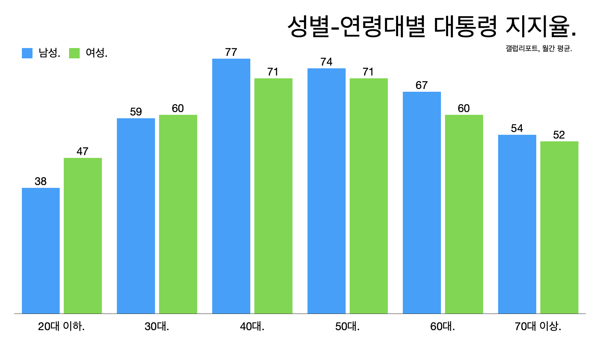 - 대통령 지지율이 가장 낮은 그룹도 이대남이다. 38%를 기록했다.