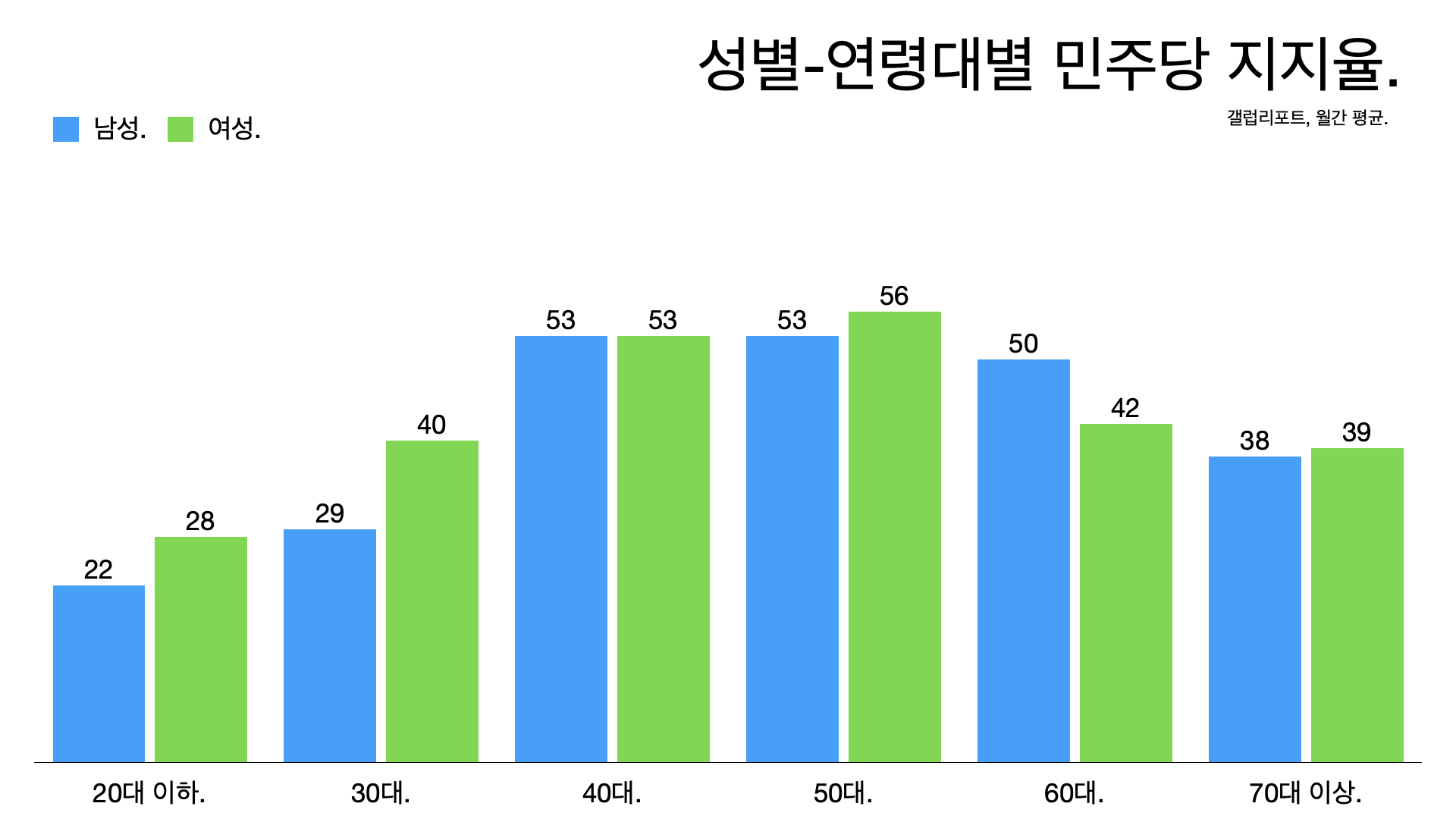 - 한국갤럽 2월 합산 통계를 보면 20대 이하 남성의 22%가 민주당을 지지하고 25%가 국민의힘을 지지한다. 모든 성별+연령별 그룹에서 이대남이 유일하다.