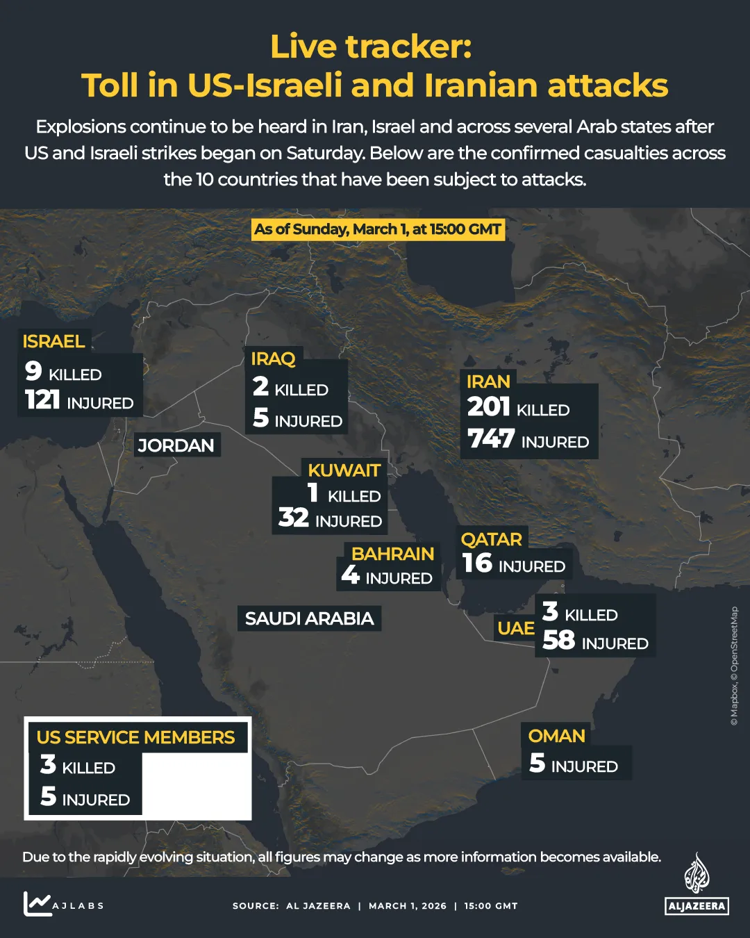 - 알자지라에 따르면 미군 사망자가 3명, 이스라엘도 9명 사망자가 발생했다.
