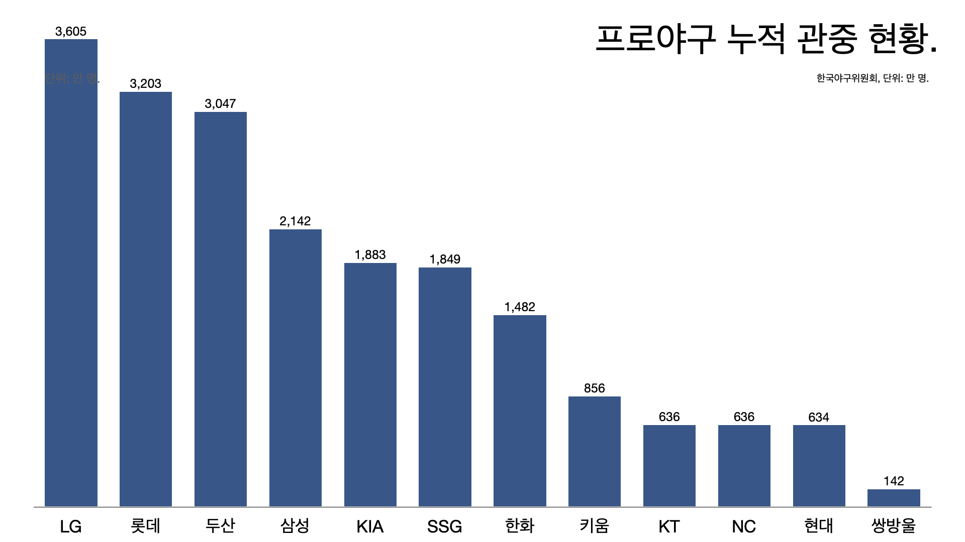 - 관중 1위는 삼성 라이온즈 164만 명. LG 트윈스(154만 명)와 롯데 자이언츠(151만 명) 순이다.