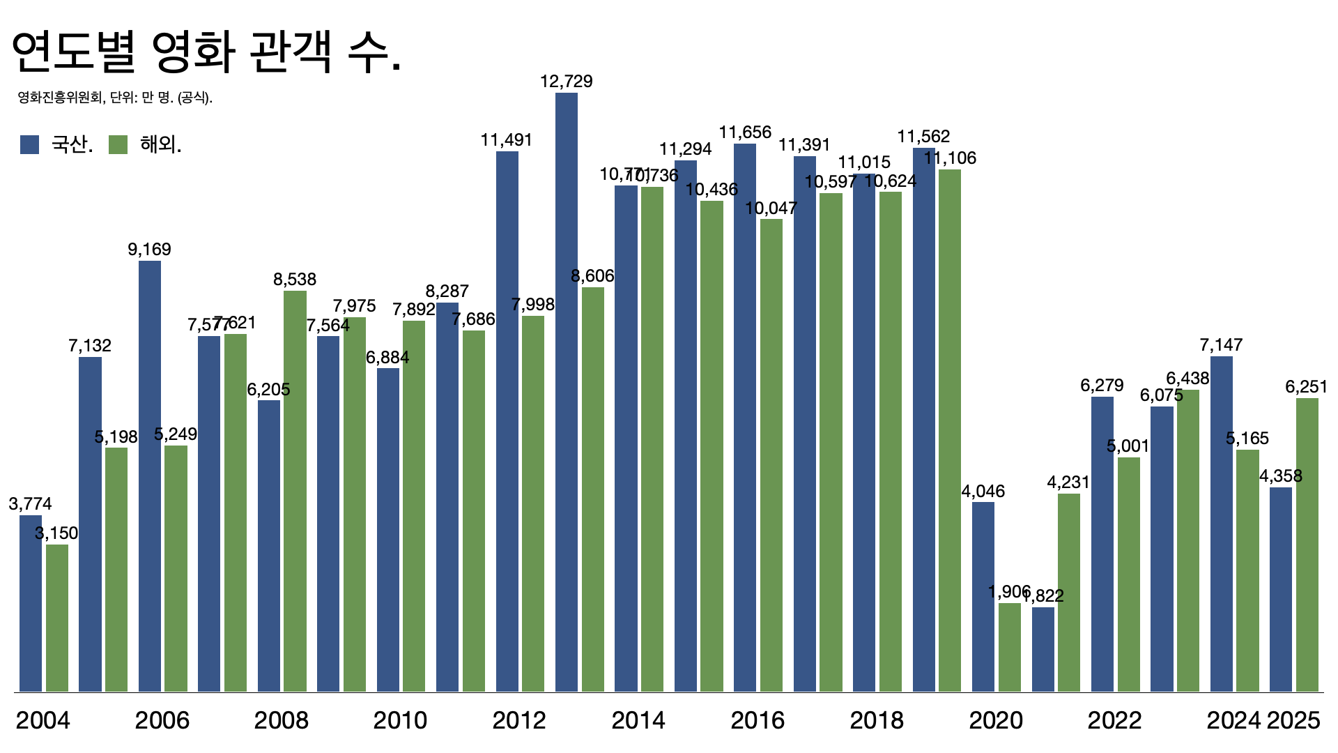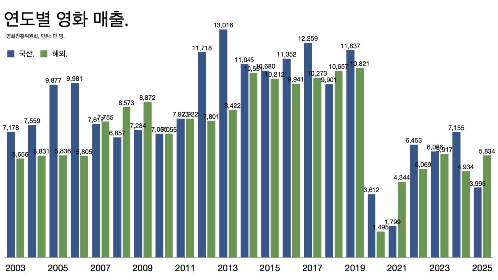 - 관객 수는 한국 영화가 1억1562만 명에서 4358만 명으로, 외국 영화는 1억1106만 명에서 6251만 명으로 줄었다.