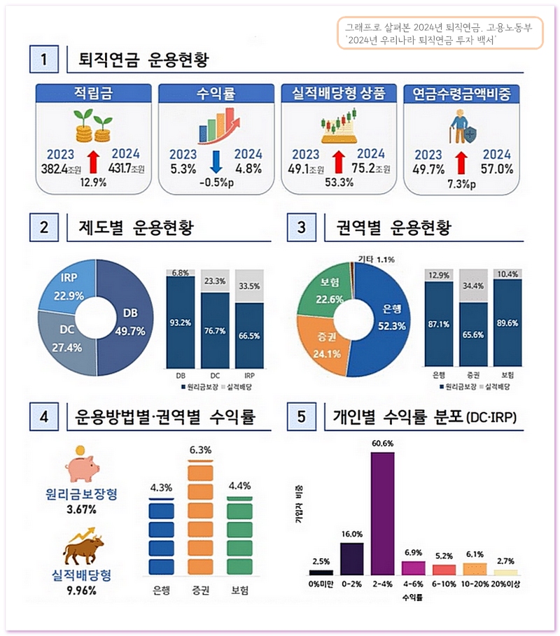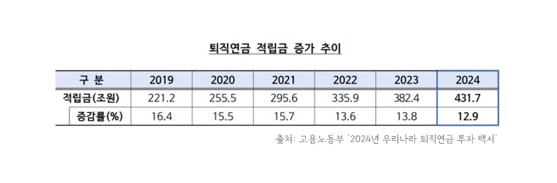 퇴직연금은 지난 10년간(2015~24년) 매년 평균 약 15% 가까이 빠르게 성장하며 덩치를 키웠고, 어느새 총적립액은 431조 원(24년 기준)까지 증가했다. 한국 국내총생산(GDP)의 16.9%에 달하는 수준이다. 체격은 커졌지만 체력까지 좋아진 것은 아니다. 지난 10년간 퇴직연금 연환산 평균수익률은 2.31%에 불과하다. 같은 기간 평균수익률 6.5%를 기록한 국민연금과 비교하면 초라한 성적이다.