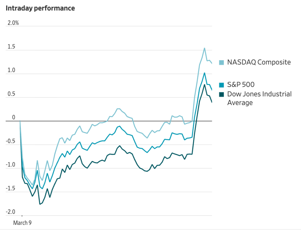 - 미국 주식 시장도 반등했다. S&P500 지수는 한때 1.5% 떨어졌다가 0.8% 상승으로 마감했다.