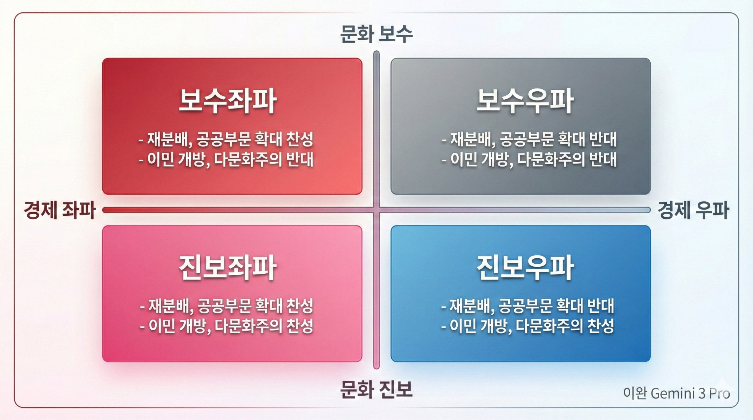 상황이 이렇다 보니 정치학자들은 과거 이분법만으로는 정치 변화를 설명하기 어렵다는 점을 강조하고 있다.⒂ 경제 분야에서 좌파적인 사람이 문화 분야에서 보수적인 경우도 관찰되고, 경제 분야에서 우파적인 사람이 문화 분야에서 동성혼 법제화나 이민 개방을 지지하는 경우도 있다는 것이다.