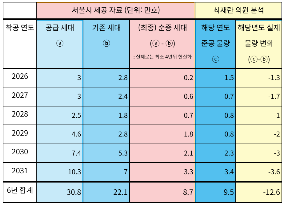 최재란 의원은 이런 관점에서 분석해서, 신통기획에 따라 2026년부터 2031년까지 매년 서울시에서 실제로 사라지는 주택과 새로 짓는 주택을 비교해 본 것이다. 서울시 자료에 따르면 2026년에 (완공시 3만 호 공급 계획으로) 2.8만 호를 철거하는데, 실제 그해에 서울에서 완공한 물량은 1.5만 호라서 실제 서울시 주택 재고는 -1.3만 호, 즉 1.3만 호가 감소한다는 것이다.