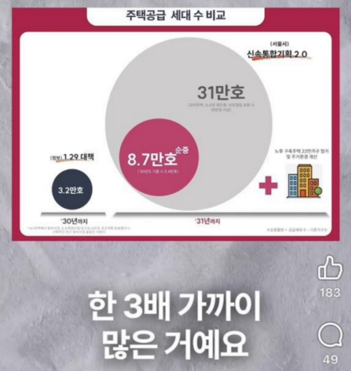 다들 서울에 주택이 부족하니 열심히 공급을 하겠다고 한다. 정부는 1.29 대책에서 공공토지 위에 새로 집을 3.2만 호 짓겠다고 발표했다. 오세훈 서울시장은 서울시 정책이 더 낫다고 주장한다. 그에 따르면 정부 정책은 시간도 많이 걸리고 효과적이지 않지만, 서울시 신속통합기획 2.0 계획에 따라 이미 준비가 다 된 신청지구를 중심으로 2031년까지 31만 호(정확히는 30.8만 호) 공급 세대 목표로 착공하면 8.7만 호가 ‘순증’한다는 것이다.
