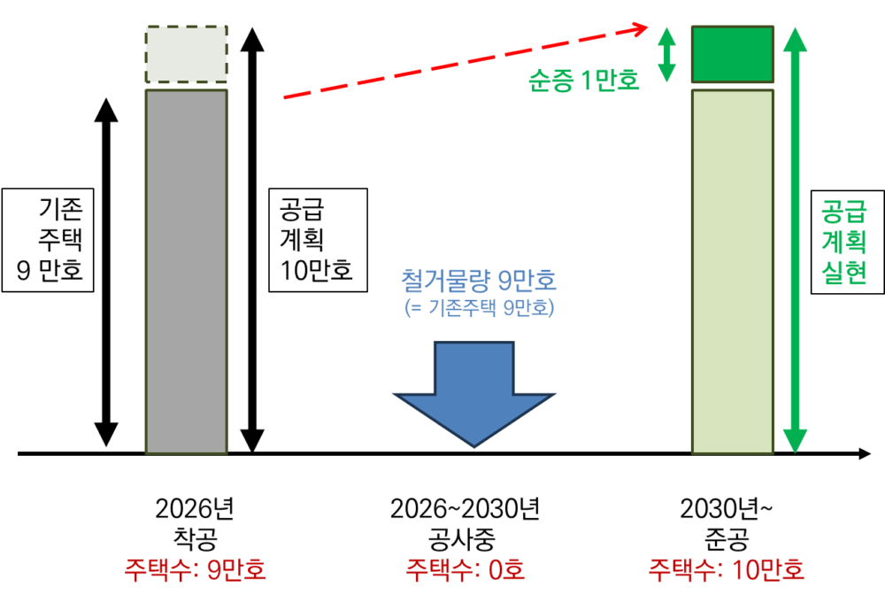 그 자리에 언젠가 30.8만 호가 언젠가 다 지어지면, 결과적으로 ‘순증 효과‘는 8.7만 호가 된다. 이는 철거 물량과 신축 물량 전체를 최종 시점에서 합산해서 보는 ‘저량(Stock)의 개념’이라고 할 수 있다.