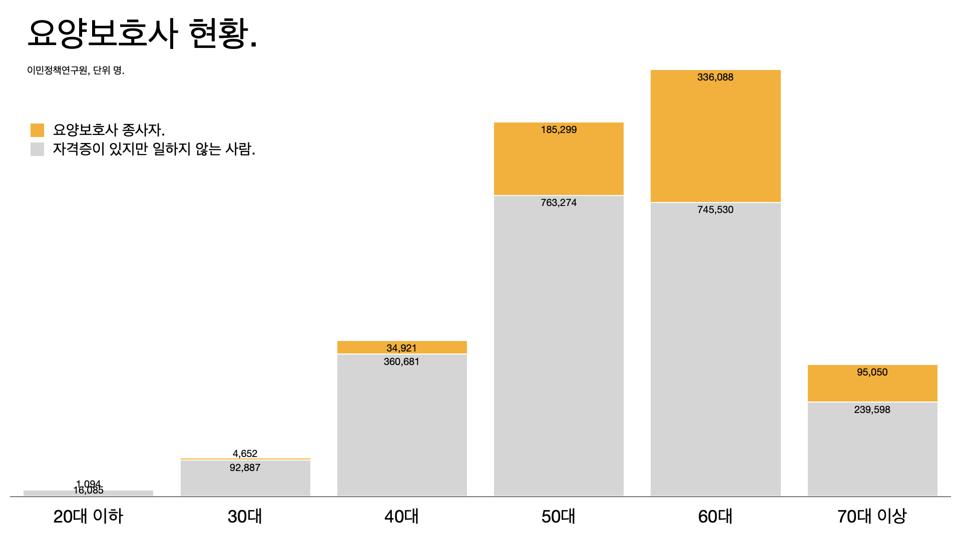 - 자격증 소지자는 많은데 실제로 일하는 사람은 22% 수준입니다. 이유가 뭘까요. 열악한 처우와 사회적 인식이 낮기 때문입니다. 한 인간이 삶을 마무리하는 과정에서 존엄성을 유지하게 할 수 있도록 도와주는 돌봄 노동이 존중받지 못하고 있습니다.