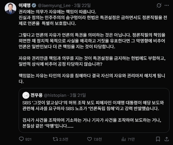- 이재명은 X에 “정치적 목적으로 사실을 왜곡하고 거짓을 유포한다면 그 악영향에 비추어 언론은 일반인보다 더 큰 책임을 지는 것이 타당하다”고 지적했다.