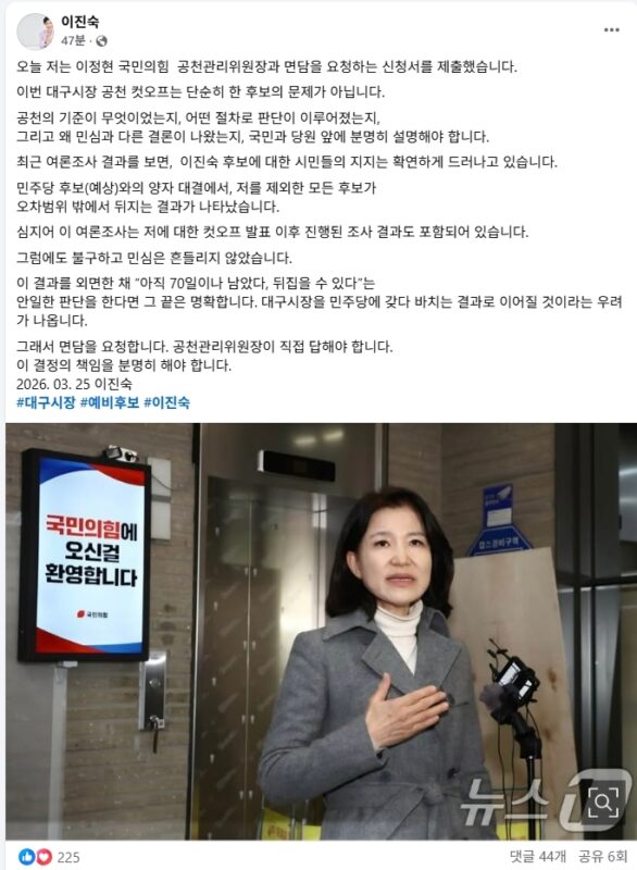 - 나경원(국민의힘 의원)이 “대구시장 후보에 현역 의원이 공천되면 그 자리에 반드시 이진숙(전 방송통신위원장)을 공천해야 한다”고 주장했다.