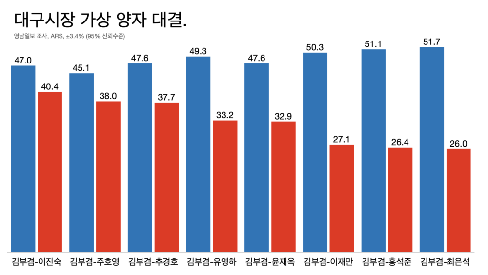 - 대구가 뒤집히나. 영남일보-리얼미터 가상 대결 조사에서 김부겸(전 국무총리)이 국민의힘 예비 후보를 모두 이겼다.