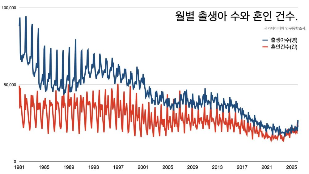 - 1월 기준으로 출산율이 0.99명까지 늘었다. 월별 출산율은 큰 의미는 없다. 2025년 연간 기준으로 0.80명이고 여전히 세계 최저 수준이다.