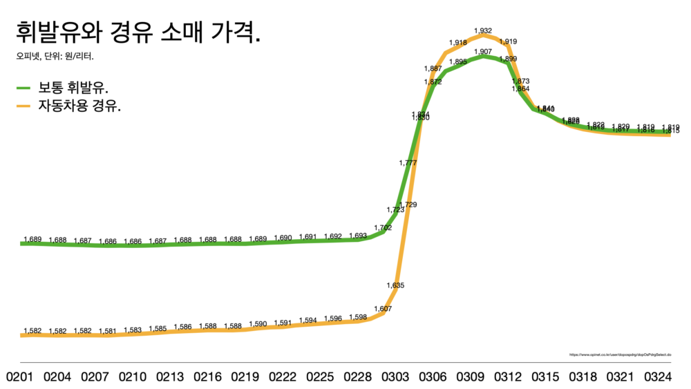 - 내일 석유 최고가격을 다시 조정한다. 싱가포르 거래소 가격으로 휘발유 가격이 2월 넷째 주 78.8달러에서 3월 넷째 주 149.5달러까지 오른 상황이다. 휘발유는 90%, 경유는 150% 올랐다.