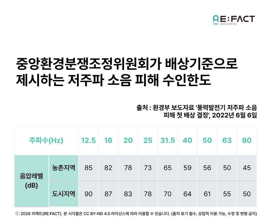 2022년 6월, 환경부 중앙환경분쟁조정위원회는 풍력발전기 저주파 소음으로 인한 정신적 피해를 호소한 주민들에게 발전사업자가 1억 3800만 원을 배상하라는 결정을 내렸다. 전남 영광군 마을 두 곳 주민 163명이 발전사업자를 상대로 총 2억 4450만 원을 배상하라고 요구한 사건이었다. 주민들은 풍력 발전 시운전이 시작되자 “풍력발전기 소음 때문에 심장이 쿵쾅거린다”, “머리가 어지럽다”, “잠이 안 온다”는 민원을 제기하다가 결국 재정신청을 냈다.