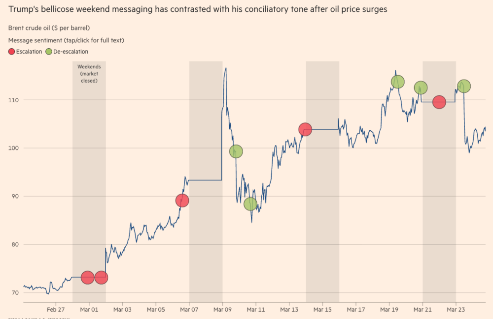 - 트럼프의 한마디에 세계적으로 금융 시장이 요동을 치고 있다. 유가가 오르면 평화를 이야기하고 유가가 떨어지면 다시 분노를 쏟아내는 패턴을 반복하고 있다. 그나마 트럼프의 변덕이 금융 시장의 패닉을 막고 있다는 게 아이러니한 상황이다.