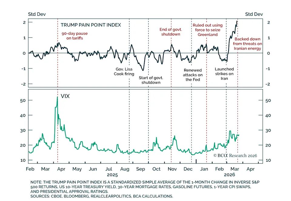 - 트럼프 고통 지수는 취임 이후 가장 높은 수준으로 올랐다. 시장의 공포 지수(VIX)는 지난해 4월에 최고를 찍었지만 트럼프 고통 지수는 지금이 가장 높다. 시간이 흐를수록 타코의 압박은 더 커진다.