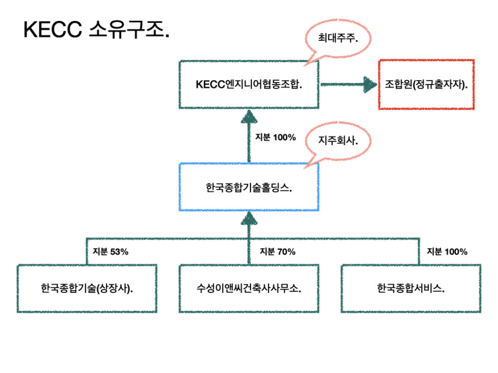- 출자자들이 조합원인 KECC엔지니어협동조합이 KECC홀딩스 지분을 100% 갖고 있고, KECC홀딩스가 상장사인 한국종합기술 지분의 53%를 갖고 있다.