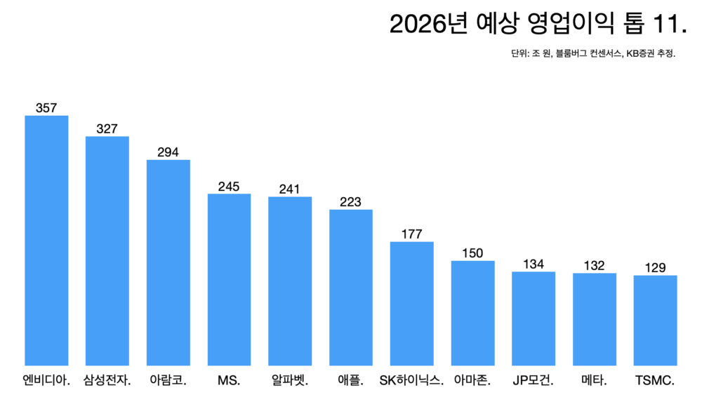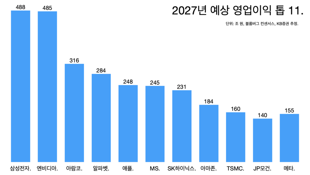 - 영업이익 세계 1위가 가능하다는 분석도 나온다. KB증권은 삼성전자 올해 영업이익을 327조 원으로, 내년 영업이익을 488조 원으로 전망했다. 올해는 엔비디아에 이어 2위, 내년에는 엔비디아를 뛰어넘을 거라는 분석이다.