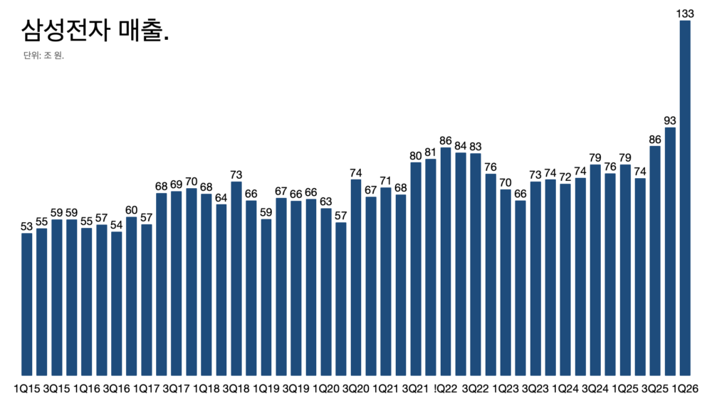 - 매출액은 133.1조 원이다. 매출액과 영업이익이 지난 분기 대비 각각 42%와 185% 늘었다.