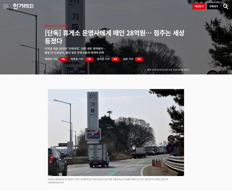 - 한편, 한겨레21은 “휴게소 관련 업계에 한국도로공사 출신이 재취업하는 ‘전관 예우’ 실태, 휴게소 운영사 관련 논란, 휴게소 물가를 올리는 불합리한 관행, 휴게소와 도로공사 정책 관련 개선이 필요한 사안 등을 취재하고 있다”며 제보를 구했다.