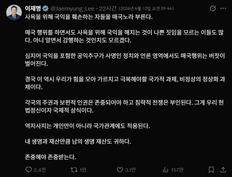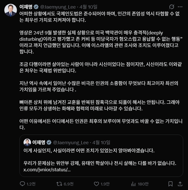 - 이스라엘 비판이 국익 논쟁으로 번지자 이재명이 반박하면서 쓴 글이다.